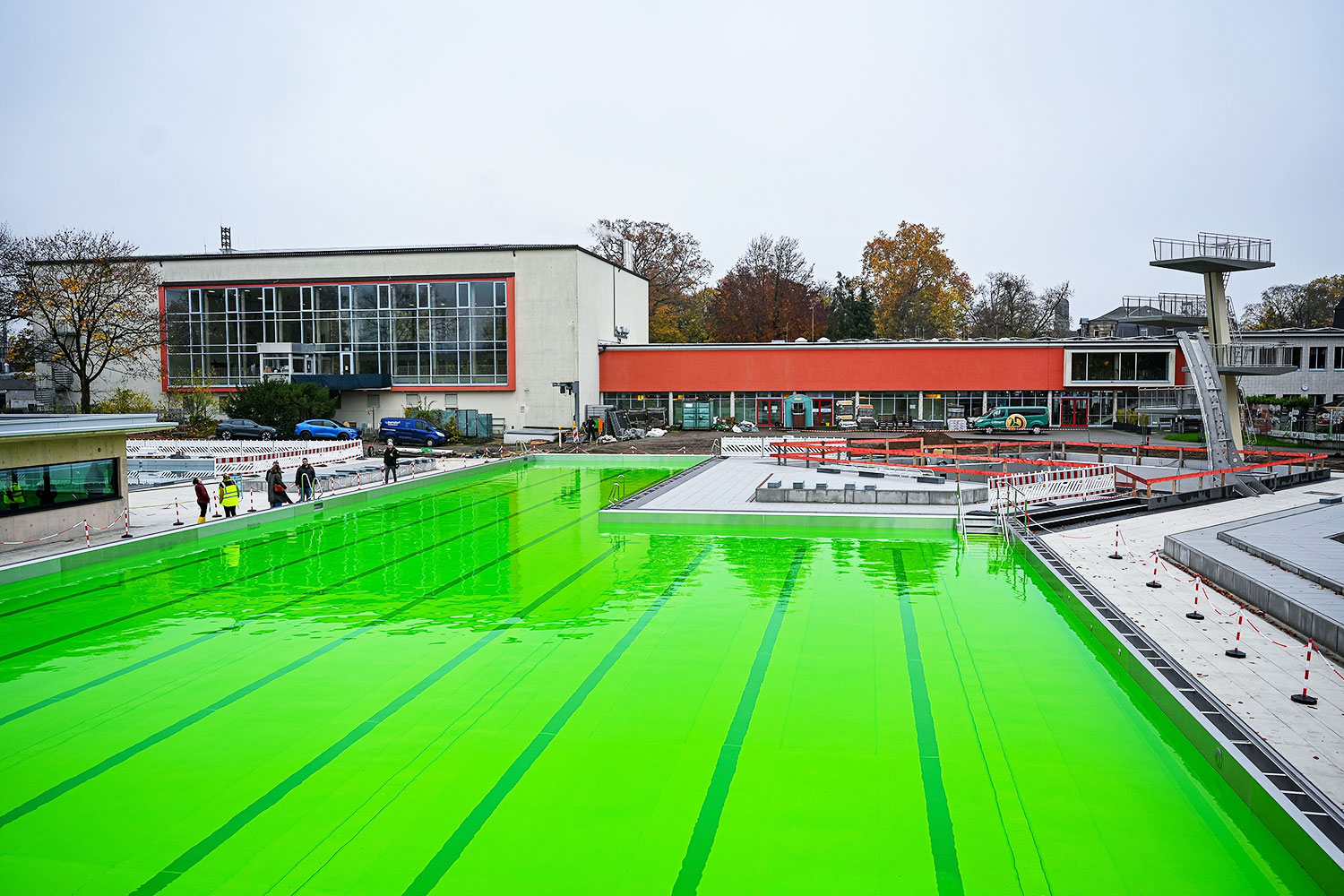 "Das Ergebnis zeigt, dass die neue Wassertechnik einwandfrei funktioniert und die Qualität den hohen hygienischen Anforderungen entspricht. Damit ist ein weiterer wichtiger Schritt für die Wiedereröffnung geschafft", so Dr. Bieri. Während des Tests wurde durch die Firma Tino Krebs Aqua Consulting GmbH Lebensmittelfarbe ins Wasser gegeben, die sichtbar machte, wie sich das aufbereitete Wasser im Schwimmbecken verteilt. Ziel war es, sicherzustellen, dass keine Zonen entstehen, in denen sich Keime vermehren könnten. Schon nach zehn Minuten war klar: Die Wasserverteilung funktioniert gleichmäßig, der Test verlief planmäßig und erfolgreich. Das Zeitlimit für einen bestandenen Test liegt bei 15 Minuten. Der Test ist laut Merkblatt 94.05 und DIN 19643 eines der Kriterien für eine Neu- oder Wiedereröffnung eines Schwimmbetriebs.